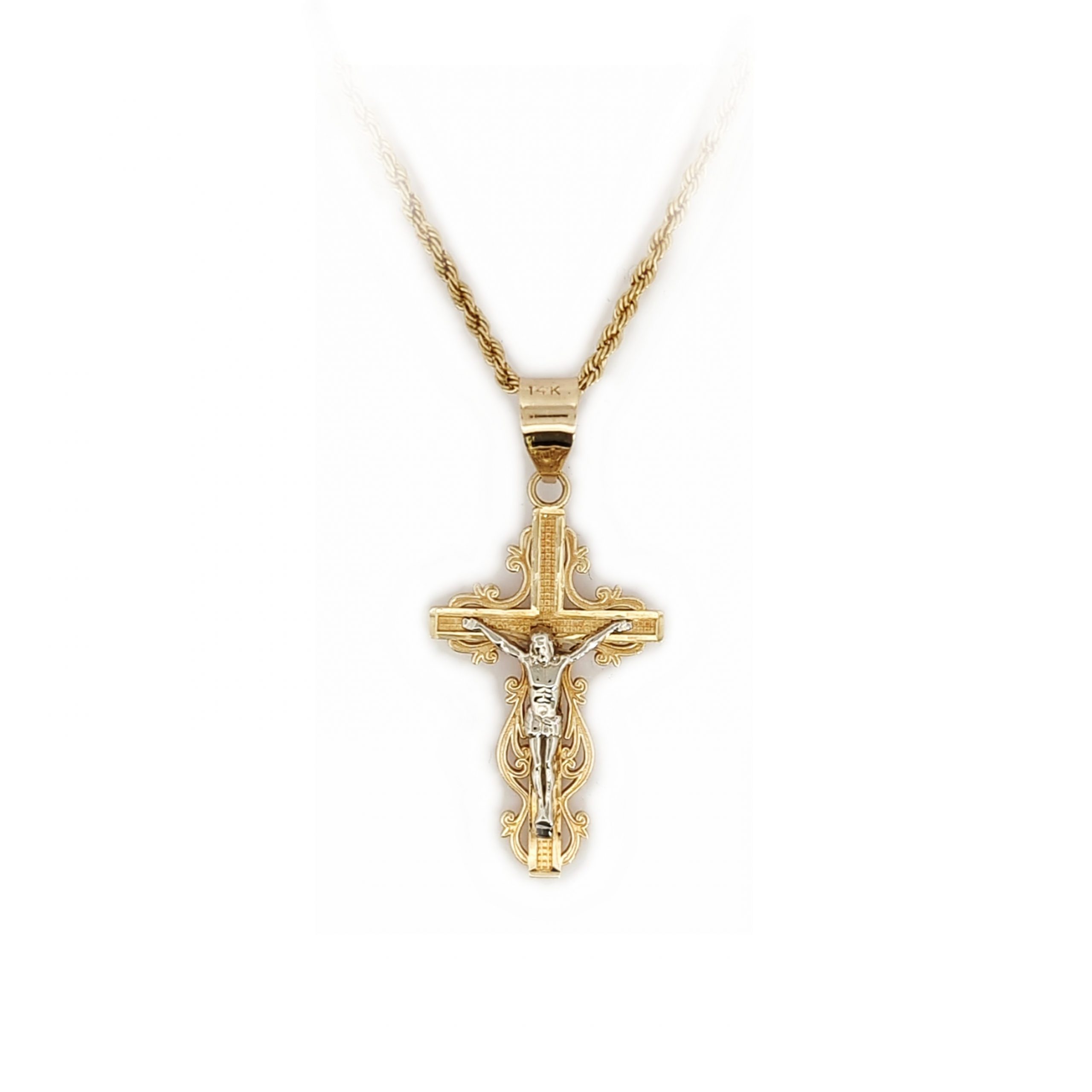 14KTT Crucifix on 14KY 20″ 1.5mm Rope Chain w/Lobster-Claw Clasp