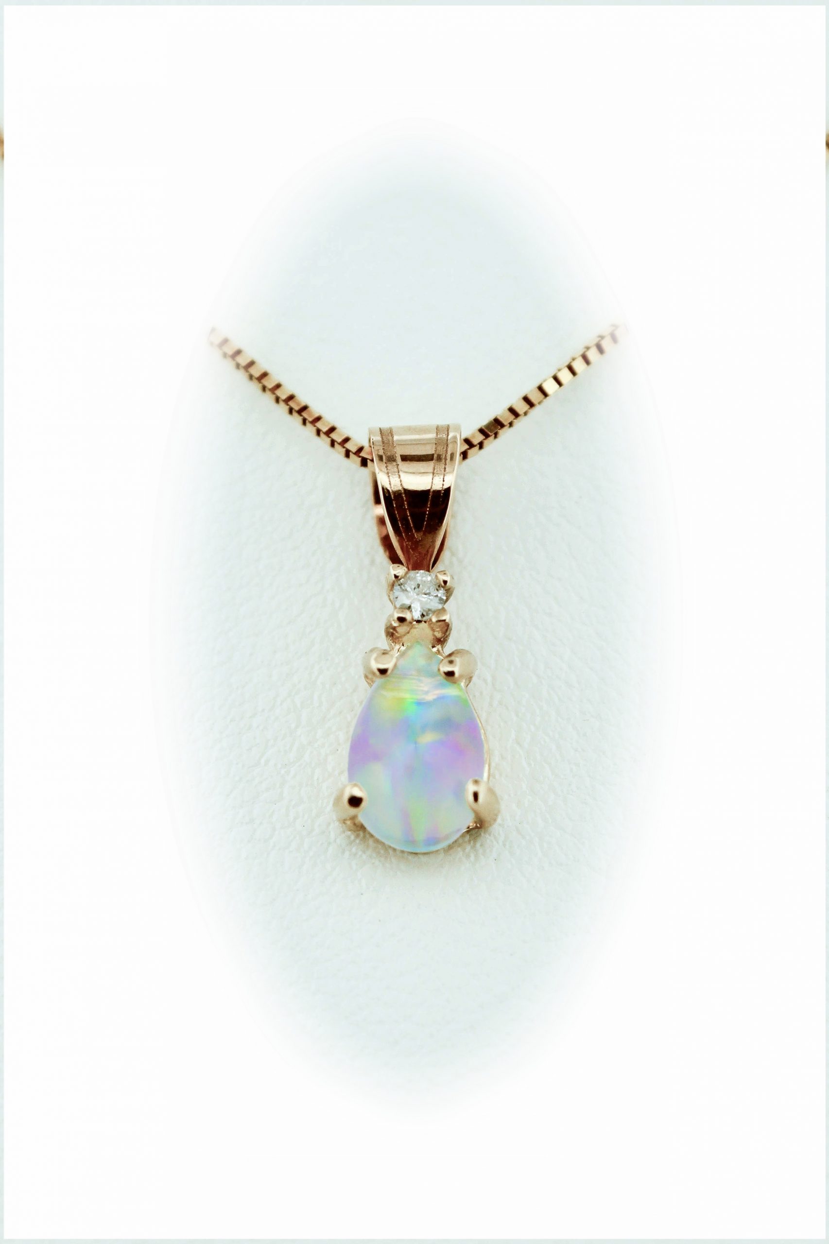 14KY 7x5mm Pear Lab-Opal, .04ctw RB Diamond Pendant on 18″ .8mm Box Chain w/ Spring-Ring Clasp