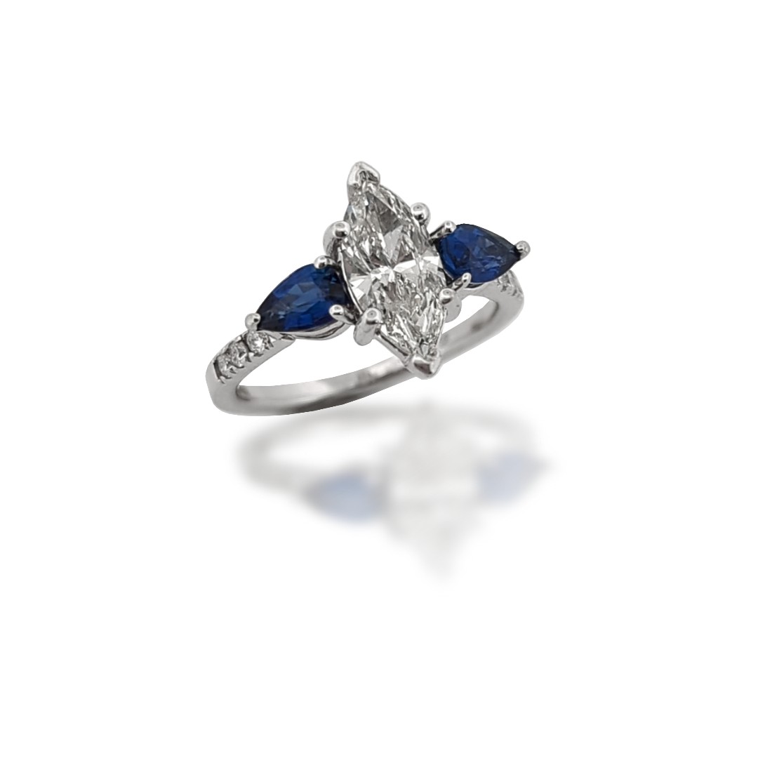 14KW 1.41ct J-I1 Marquis Diamond w/.95ctw (2)Pear Sapphires w/.11ctw G-H, SI (6)RB Diamonds Size 7